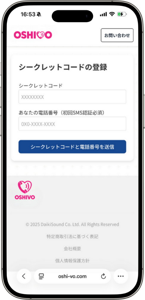 QRコードから専用ページへアクセスし、シークレットコードと電話番号を入力します。
